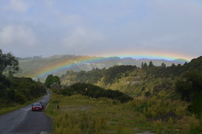 Fun Fact: Wir hatten auf Grund des schlechten Empfangs des Radios Ralfs Handy über Bluetooth mit dem Auto verbunden und hörten darüber Musik. Irgendwann hielten wir an einer Wiese weil hinter uns ein schöner Regenbogen zu sehen war. Ich hüpfte schnell raus, machte drei Bilder und sprang wieder rein, weil wir vor einem Wohnwagen wieder auf die Straße wollten. 10 Sekunden später, ging die Musik aus – keine Verbindung zum Telefon. Wir schaut uns an und Ralf fragte mich, ob ich das Handy nicht gerade noch auf dem Schoss hatte… Wir drehten um und was soll ich sagen…. es lag im Grass und wartete auf uns 😉 Ich muss nicht sagen, dass wir beide extrem froh waren, dass wir über das Handy Musik gehört haben. Uns wäre das im Leben nicht aufgefallen. Achso und hier der Regenbogen, von dem ich sprach 🙂